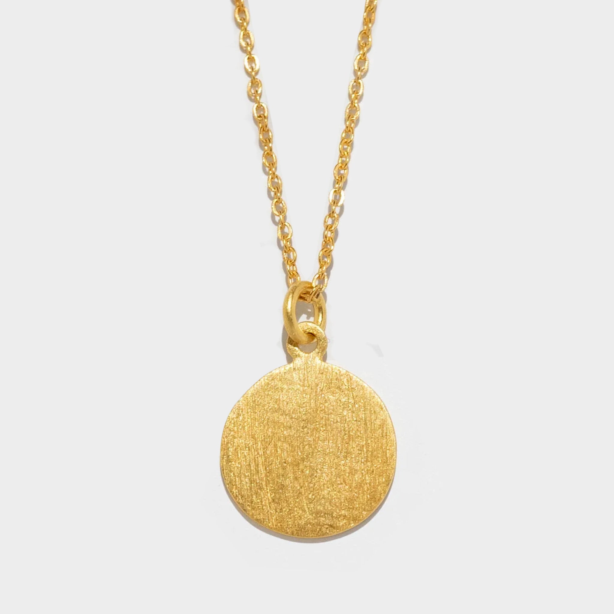 Handgefertigte Halskette Maelle mit einfachem rundem Coin Anhänger von Fleurs des Prés. Der Coin hat eine leicht matt gebürstete Oberfläche, die im Licht wunderbar zart schimmert.