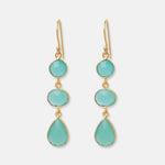 Ohrhänger Tara von Fleurs des Prés. Lange Ohrhämnger mit drei Schmucksteinen aus türkisblauem Aqua Chalzedon. Die Steine in runder, ovaler und tropfenförmiger Form fügen sich zu einem harmonischen Gesamtbild zusammen. Die Ohrhaken sind aus 18 Karat vergoldetem Silber gefertigt und lassen sich leicht einhängen und angenehm tragen. Der Chalzedon hat einen kräftigen, natürlichen Türkiston, der je nach Lichteinfall lebendig variiert.