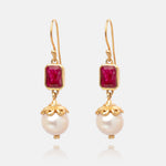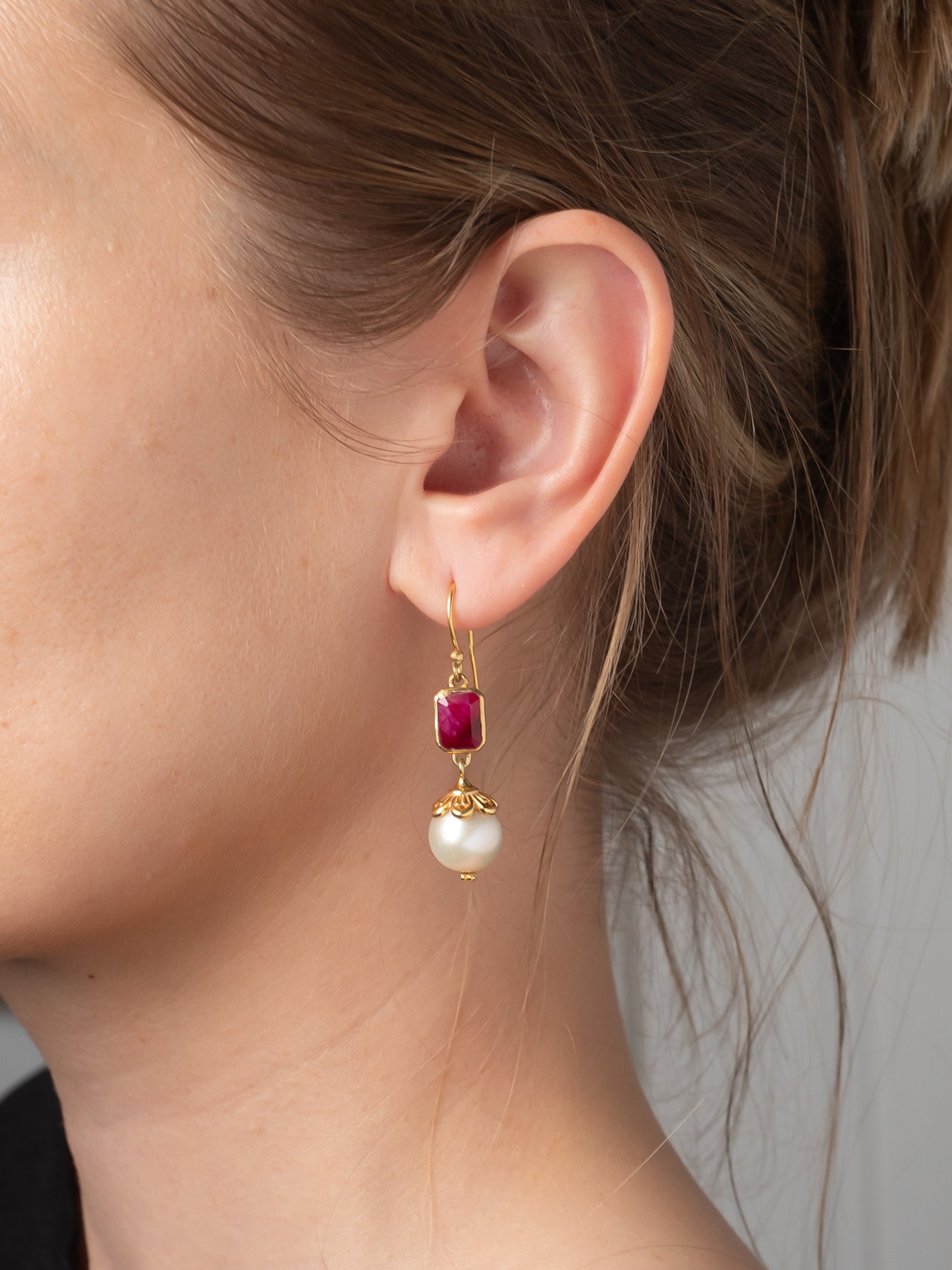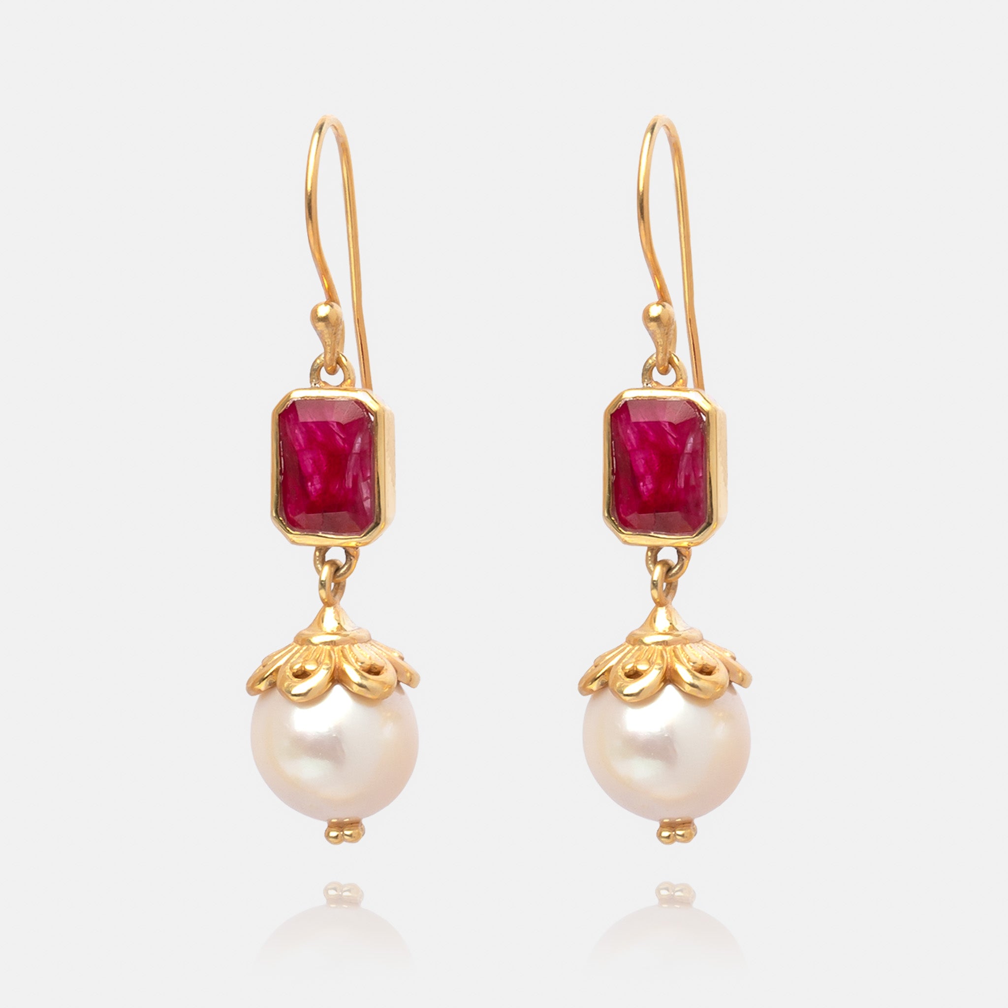 Vergoldete Ohrhänger mit rechteckigen Rubin im Facettenschliff und einer runden Perle, die mit einem vergoldeten Element in Blütenform gefasst ist. Die kräftige rote Farbe des Rubins bildet einen schönen Kontrast zum schimmernden Perlmutt der Perle. Jedes Paar ist handgefertigt.