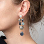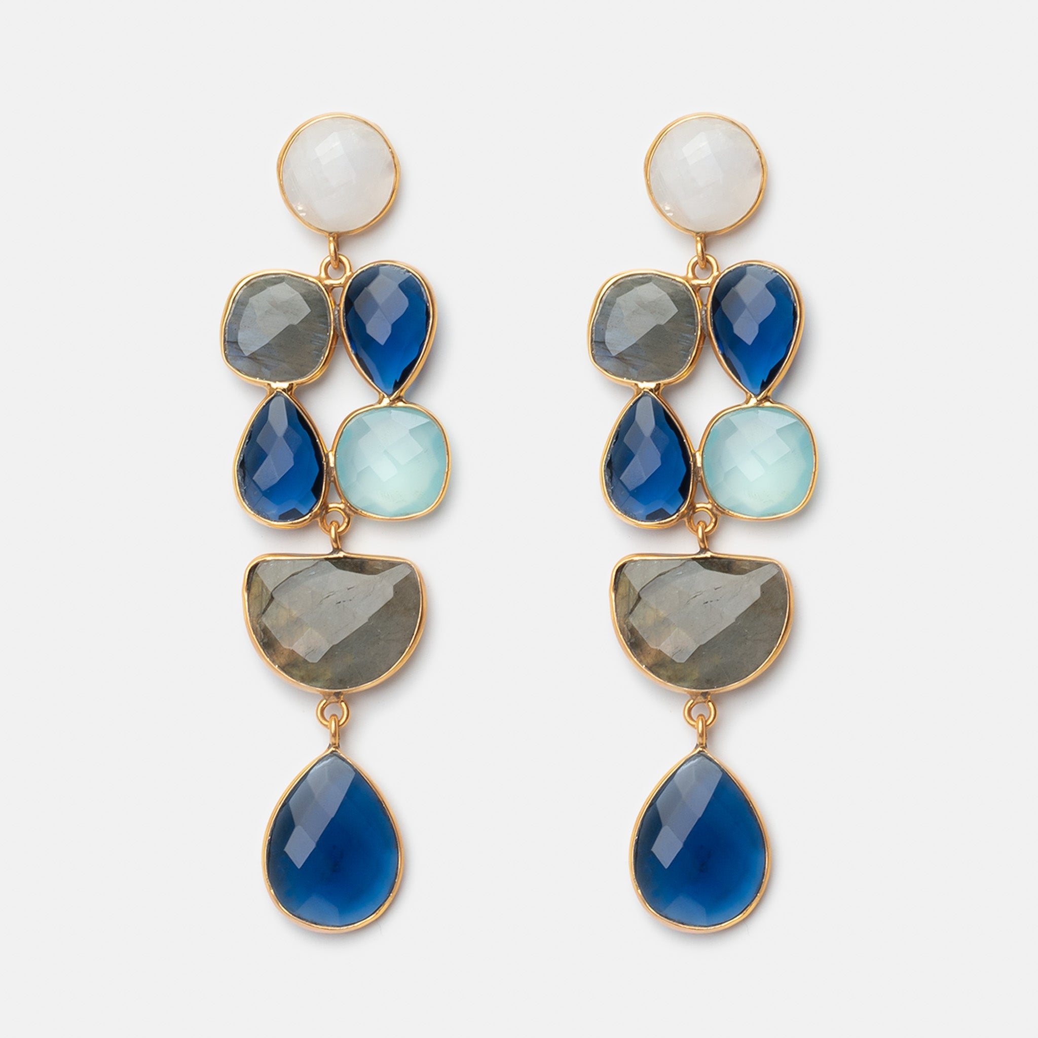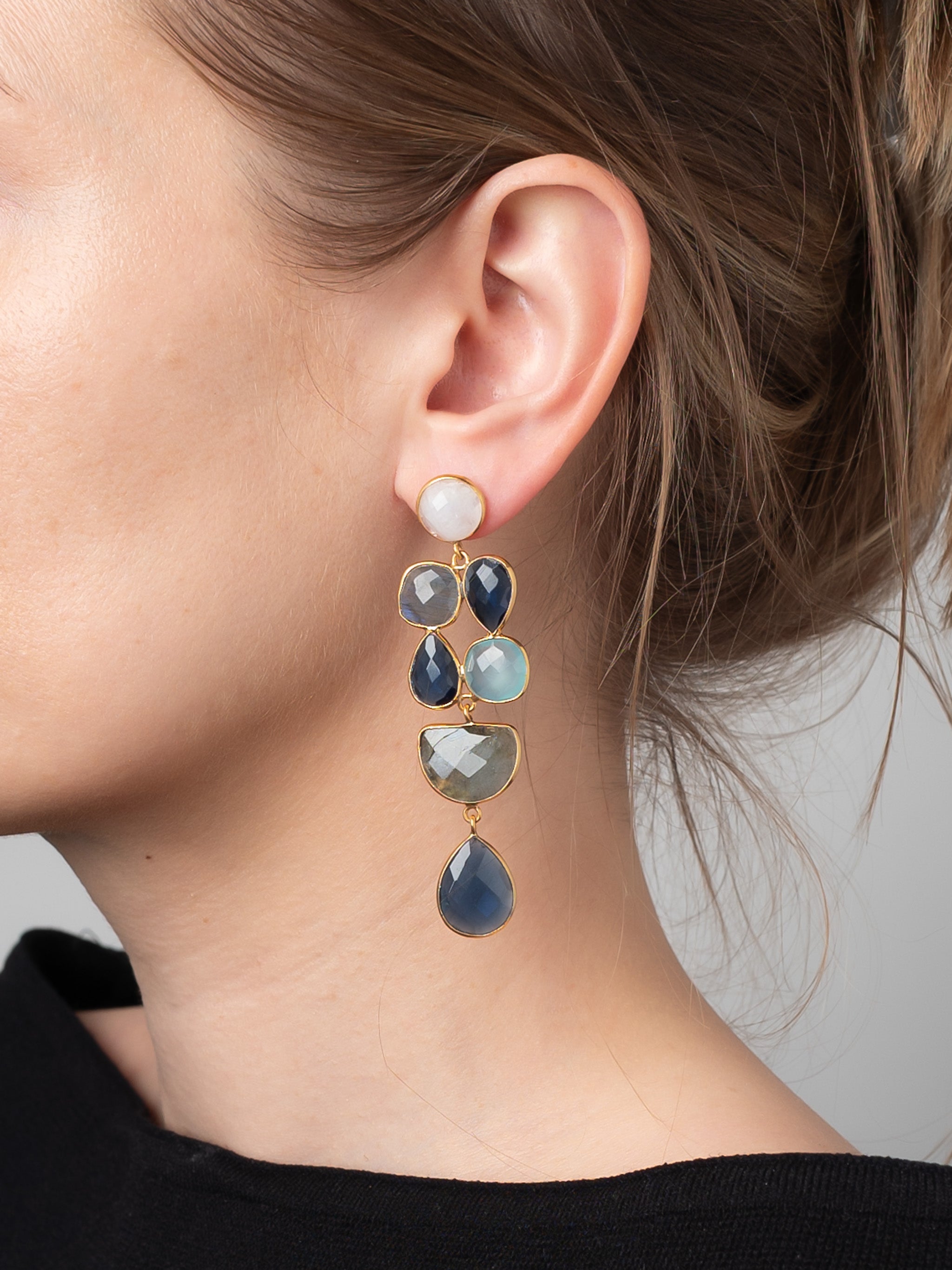 Statement Ohrringe Mason von Fleurs des Prés. Extravagante Ohrstecker mit einer Kombination aus verschiedenen Schmucksteinen: runder Mondstein, facettierte Topas- und Chalzedon-Steine in Tropfen- und Quadratform sowie halbmondförmiger und tropfenförmiger Labradorit. Die Steine sind in feine Fassungen aus vergoldetem Silber eingefasst und bilden eine harmonische Abfolge unterschiedlicher Formen und Farben. Jedes Paar ist handgefertigt.