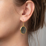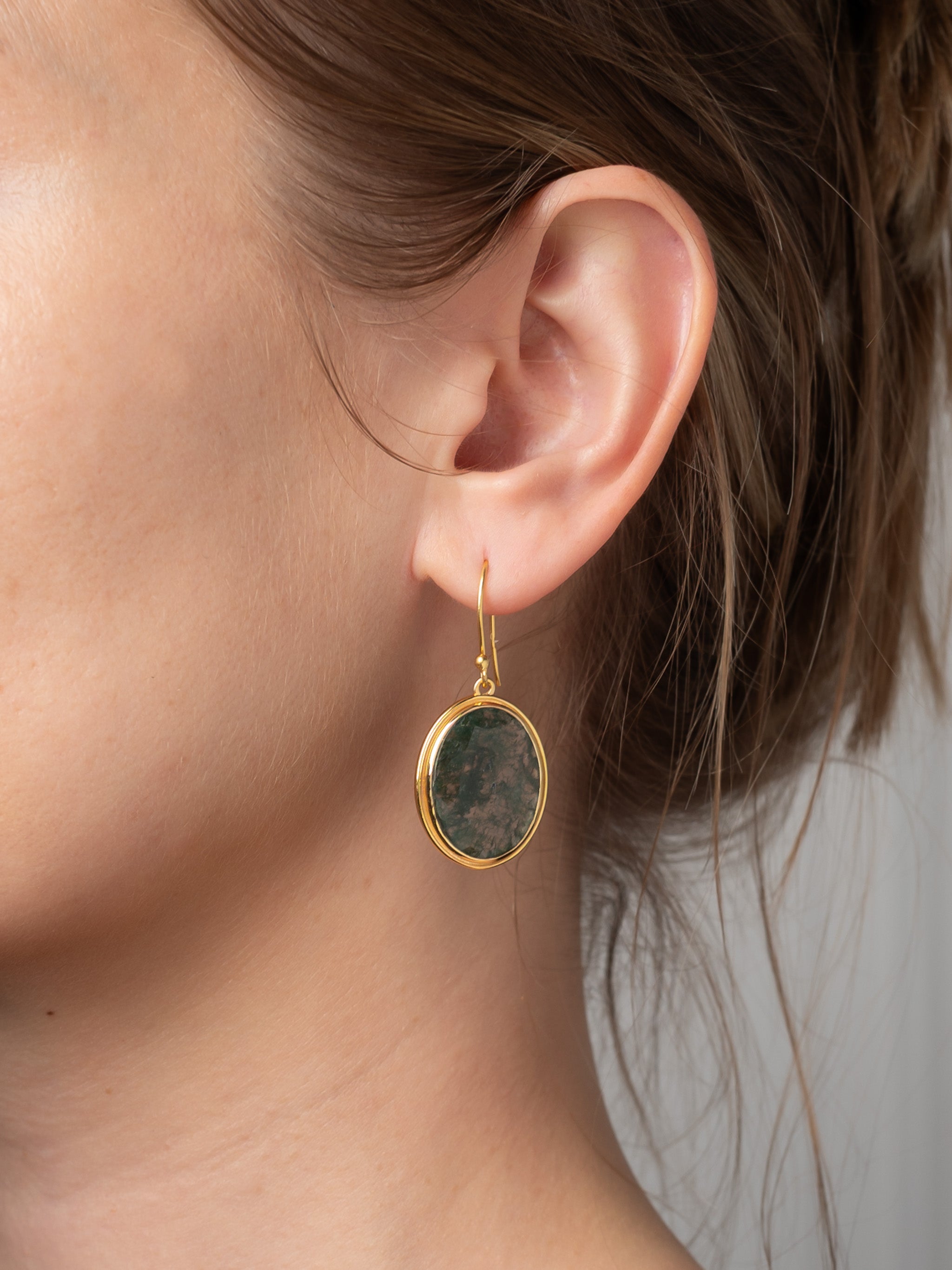 Ohrhänger mit ovalen Schmucksteinen aus Moss Agate, eingefasst in eine Fassung aus 18 Karat vergoldetem Silber. Die Steine zeigen ihre charakteristische Maserung in natürlichen Grau- und Grüntönen, wodurch jedes Paar ein Unikat ist. Die Ohrhaken lassen sich einfach einhängen und sorgen für ein angenehmes Tragegefühl. Handgefertigt.