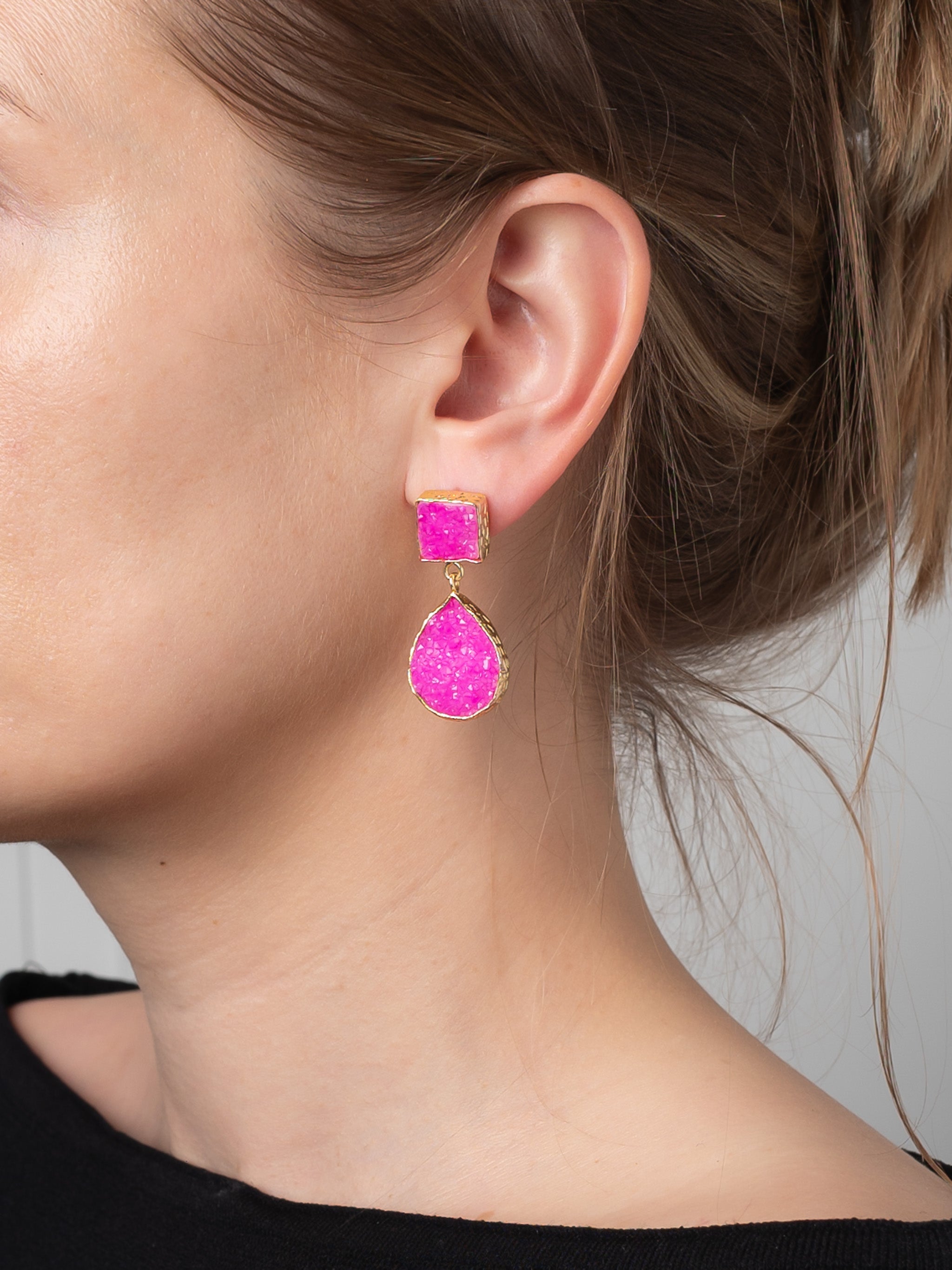Ohrstecker Tessa von Fleurs des Prés mit pinkem Druzy Quarz. Ausgfallene Statement Ohrstecker mit einem quadratischen und tropfenförmigen Schmuckstein aus pinkem Druzy Quarz.