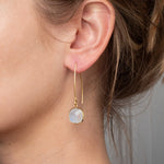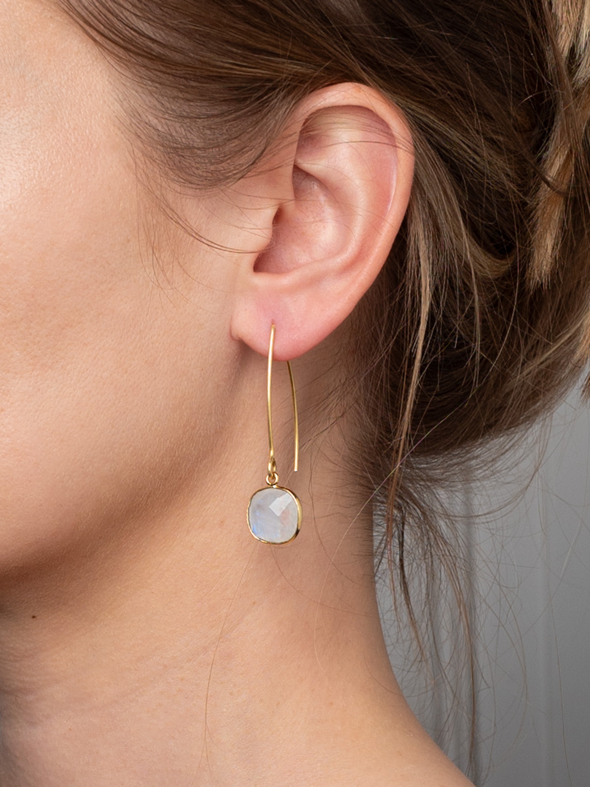 Vergoldete Ohrringe mit Mondstein Anhänger Design. Schöne minimalistische Ohrhänger, die sich durch das dezente Design vielfältig kombinieren lassen. Der Mondstein erzeugt im Licht feine Reflexe in Blau- und Rosetönen, was für einen zusätzlichen besonderen Effekt sorgt.
