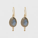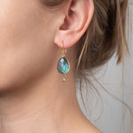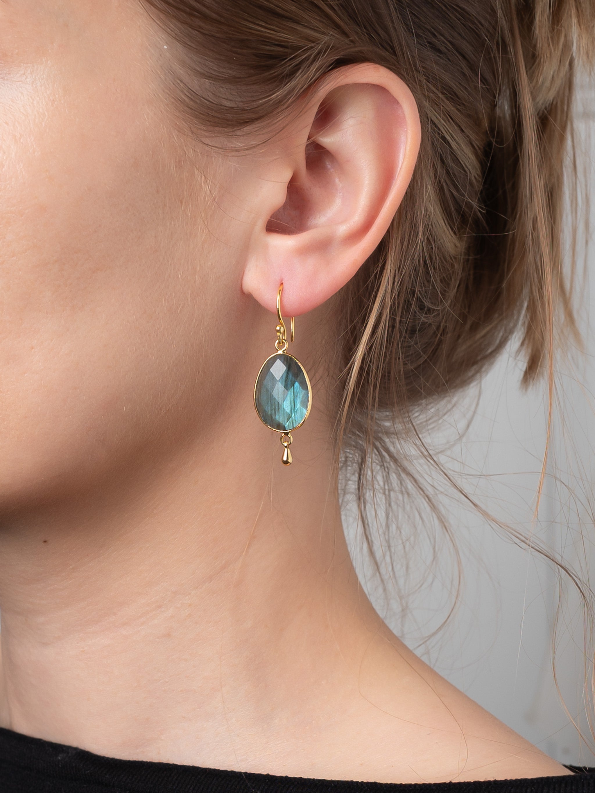 Elegante Ohrringe mit echtem Labradorit in ovalem Schliff und kleiner vergoldeter Perle. Durch die kleine Goldperle entsteht ein dezenter Vintagelook, was den besonderen Reiz dieser Ohrringe ausmacht. Der Labradorit erzeugt im Licht leuchtendblaue Reflexe, was für einen zusätzlichen besonderen Effekt sorgt.
