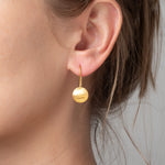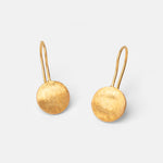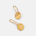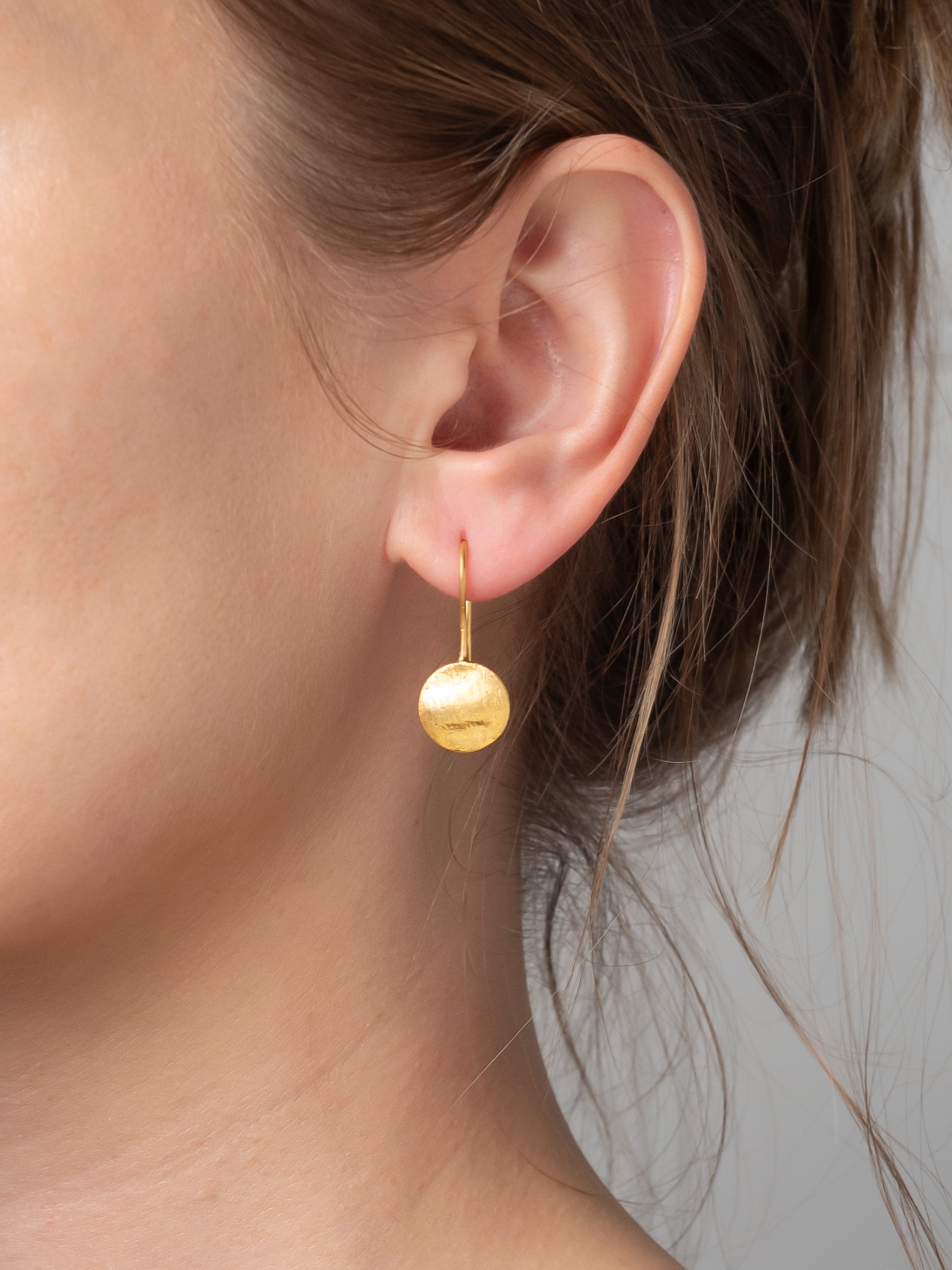 Zeitlose Ohrhänger mit runden Elementen aus mit 18 Karat vergoldetem Silber. Die Oberfläche wird in Handarbeit gebürstet und erhält dadurch eine feine Struktur mit dezentem Schimmer. Die Haken lassen sich unkompliziert einhängen und sorgen für angenehmen Tragekomfort. Jedes Paar ist handgefertigt und einzigartig in seiner Ausführung.