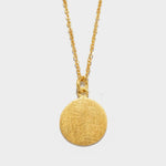 Handgefertigte Halskette Maelle mit einfachem rundem Coin Anhänger von Fleurs des Prés. Der Coin hat eine leicht matt gebürstete Oberfläche, die im Licht wunderbar zart schimmert.