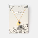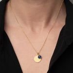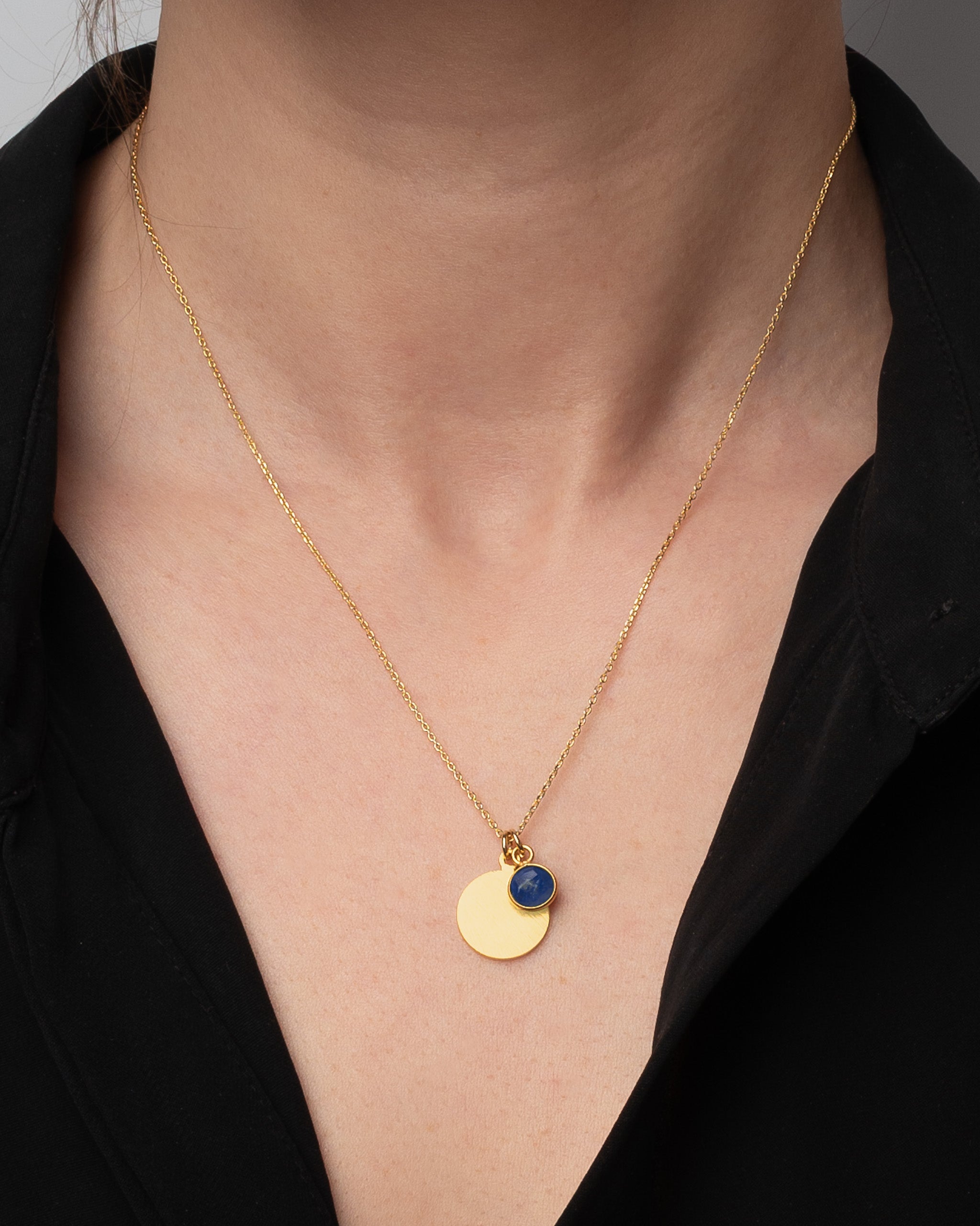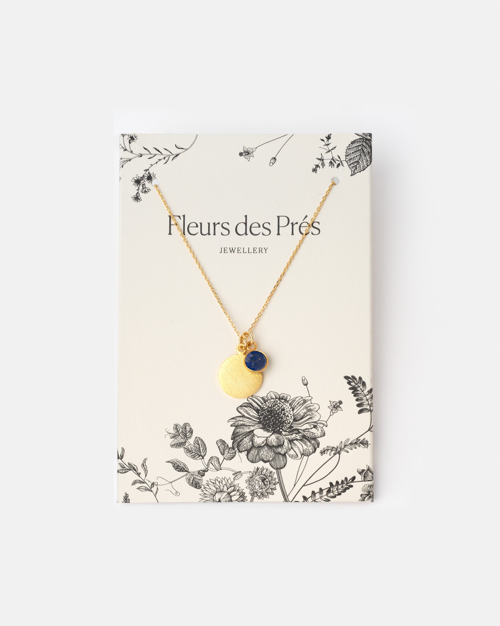 Handgefertigte Halskette Maelle mit Coin und blauem Lapislazuli Anhänger von Fleurs des Prés. Der Coin hat eine leicht matt gebürstete Oberfläche, die im Licht wunderbar zart schimmert. Die Ergänzung mit dem kleinen Schmuckstein macht diese Halskette zu einem wunderschönen klassischen Schmuckstück.