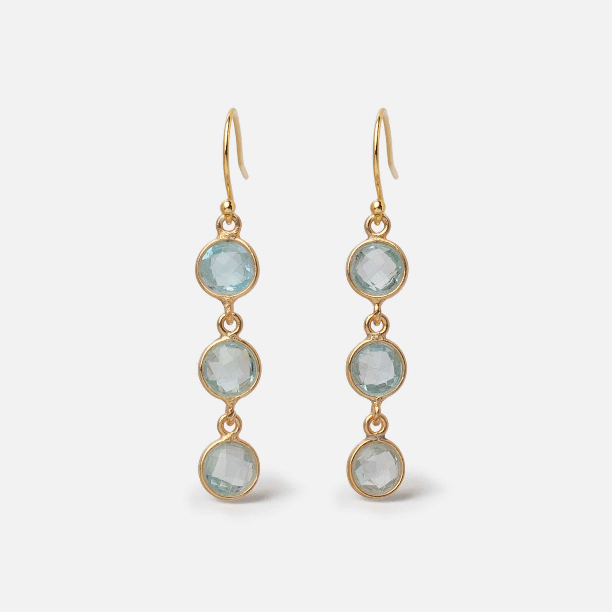 Vergoldete Ohrhänger Charlotte von Fleurs des Prés mit drei Steinen aus blauem Aquamarin.