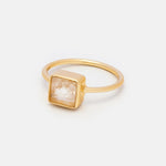 Handgefertigter Ring mit quadratischen Mondstein. Der Stein hat einen klassischen Brillantschliff mit flacher Oberfläche, was die natürliche Farbe des Steins besonders gut zur Geltung bringt.
