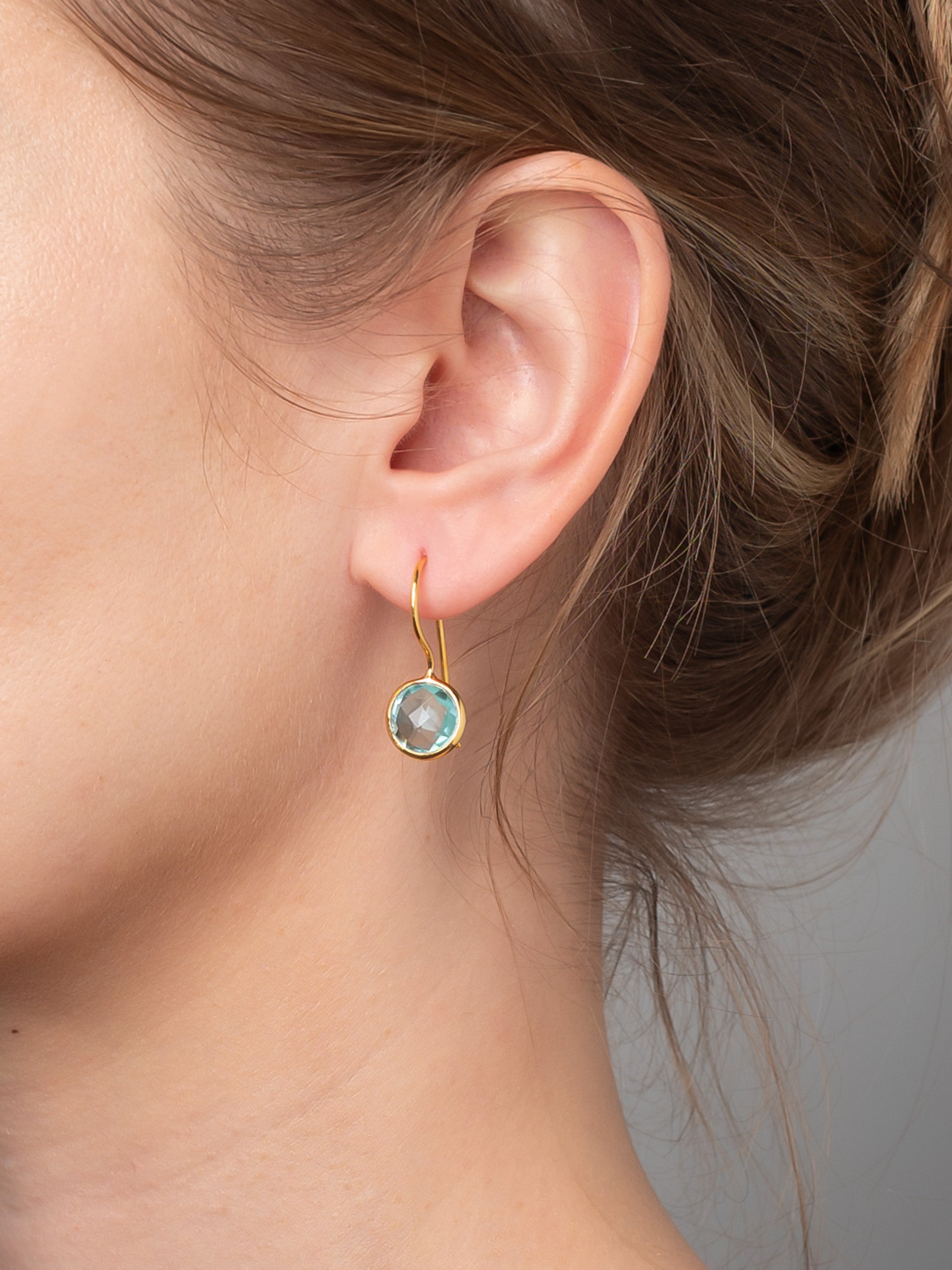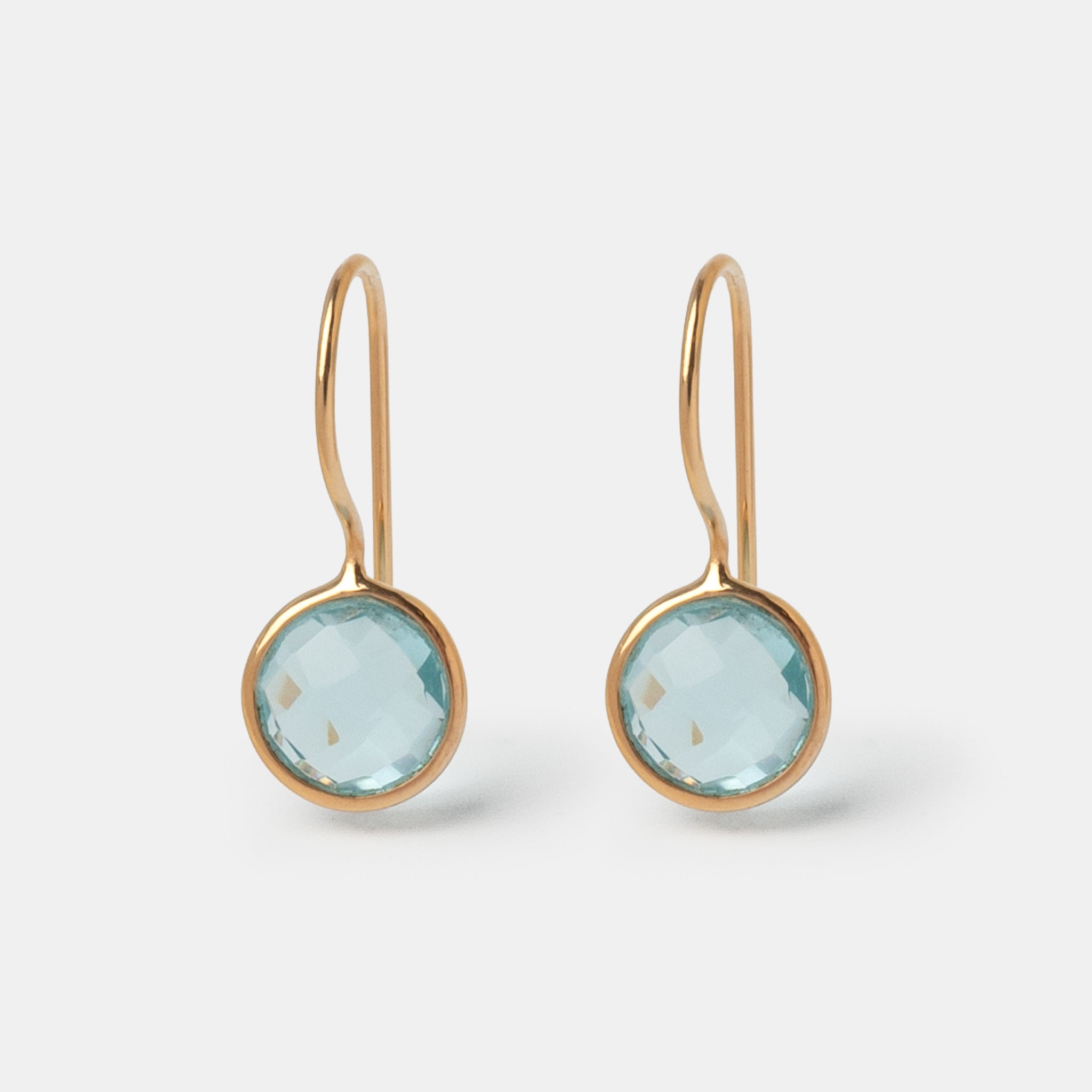 Kleine runde Ohrhänger Lille von Fleurs des Prés mit einem Schmuckstein aus hellblauem Aquamarin Quartz. Hübsche und unkomplizierte Ohrringe für einen farbigen Akzent an jedem Tag.