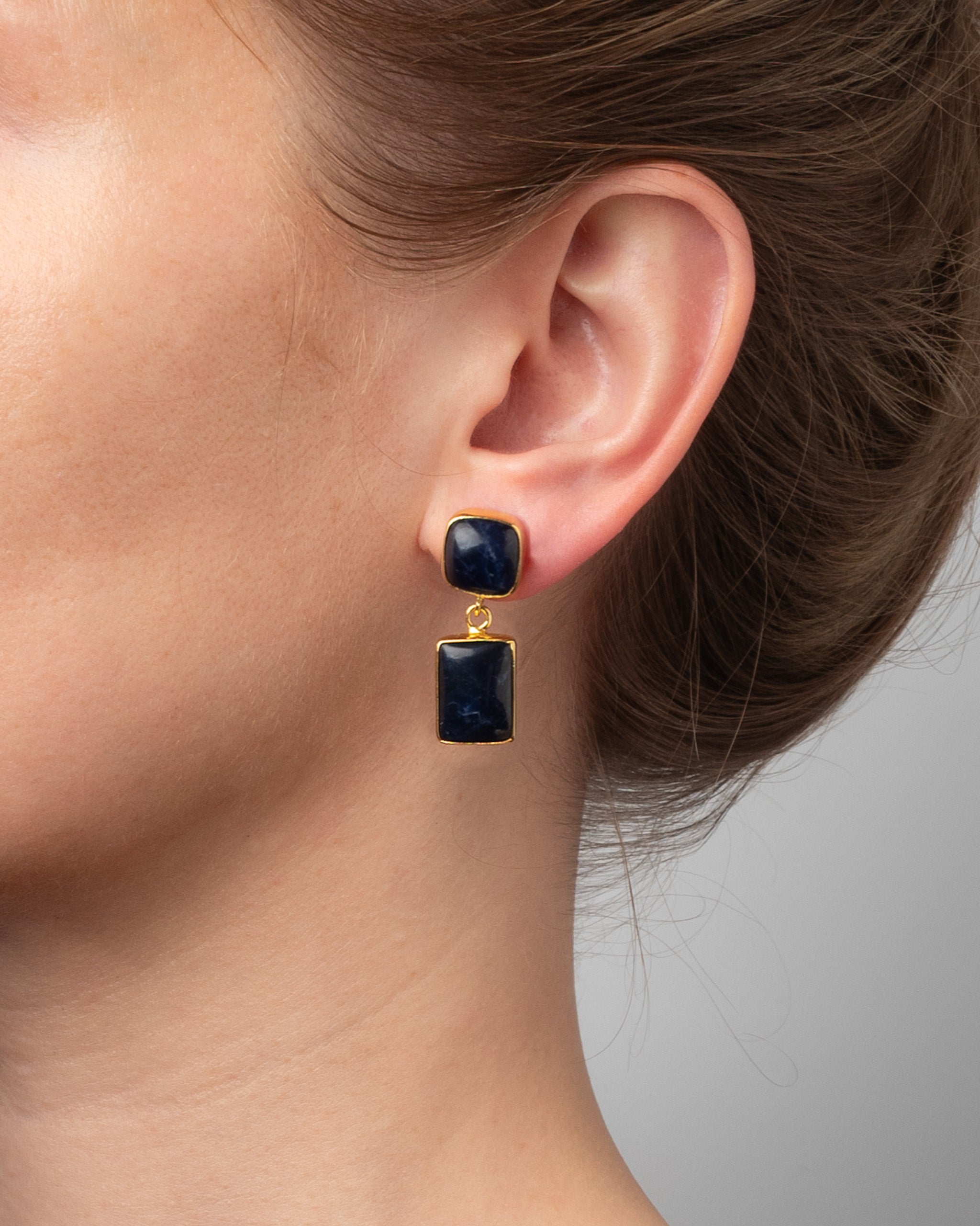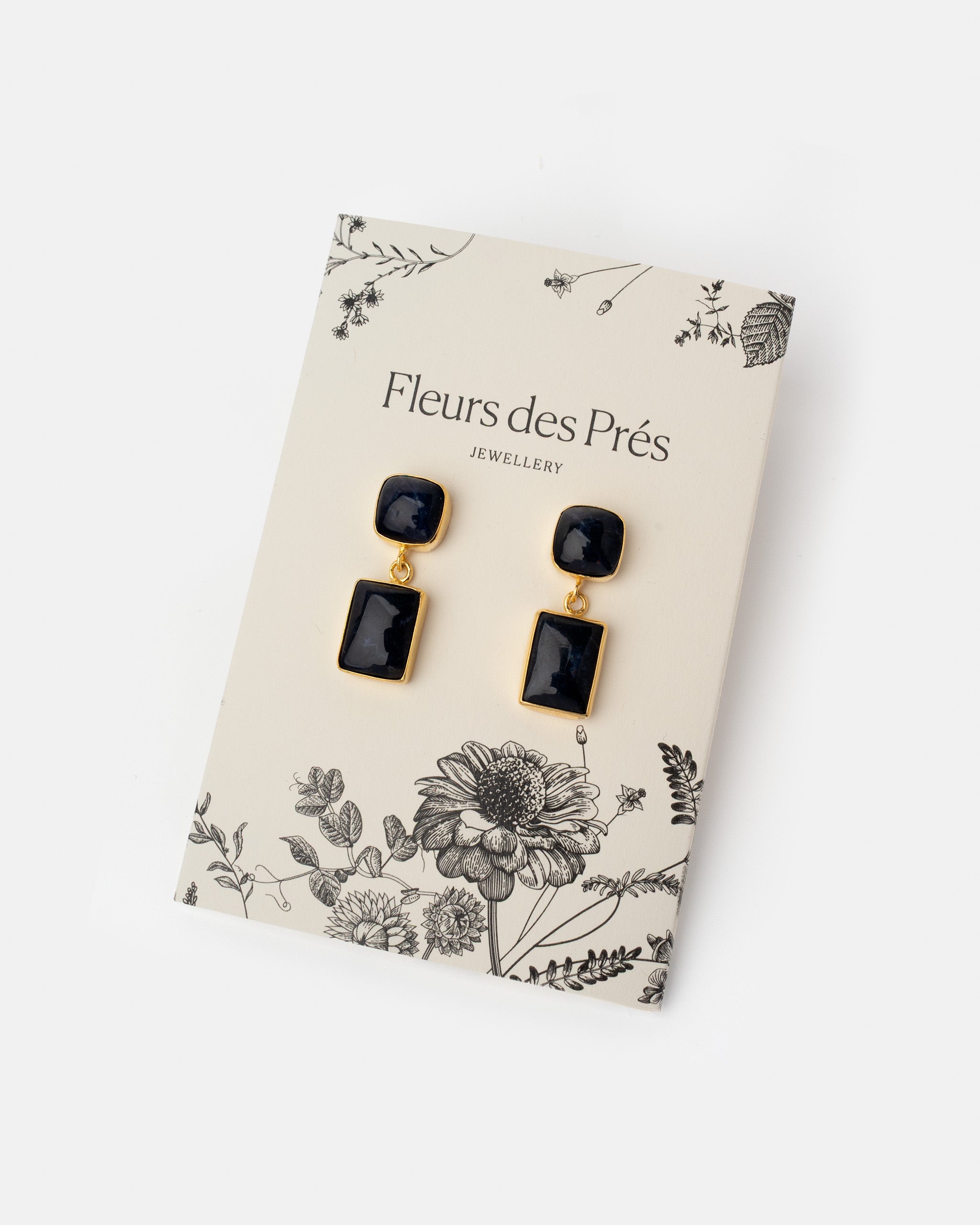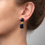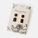Vergoldete Ohrhänger Thalie von Fleurs des Prés mit schwarzem Onyx. Die Ohrstecker im Art Deco Stil verbinden geometrischen Formen mit der natürlichen Schönheit des Schmucksteins. Der quadratische Stein mit Stecker trägt einen rechteckigen Stein an einem feinen Ring. Die Schmucksteine sind in einem zarten Rahmen aus 18 Karat vergoldetem Messing gefasst. Handgefertigt.