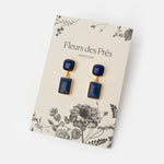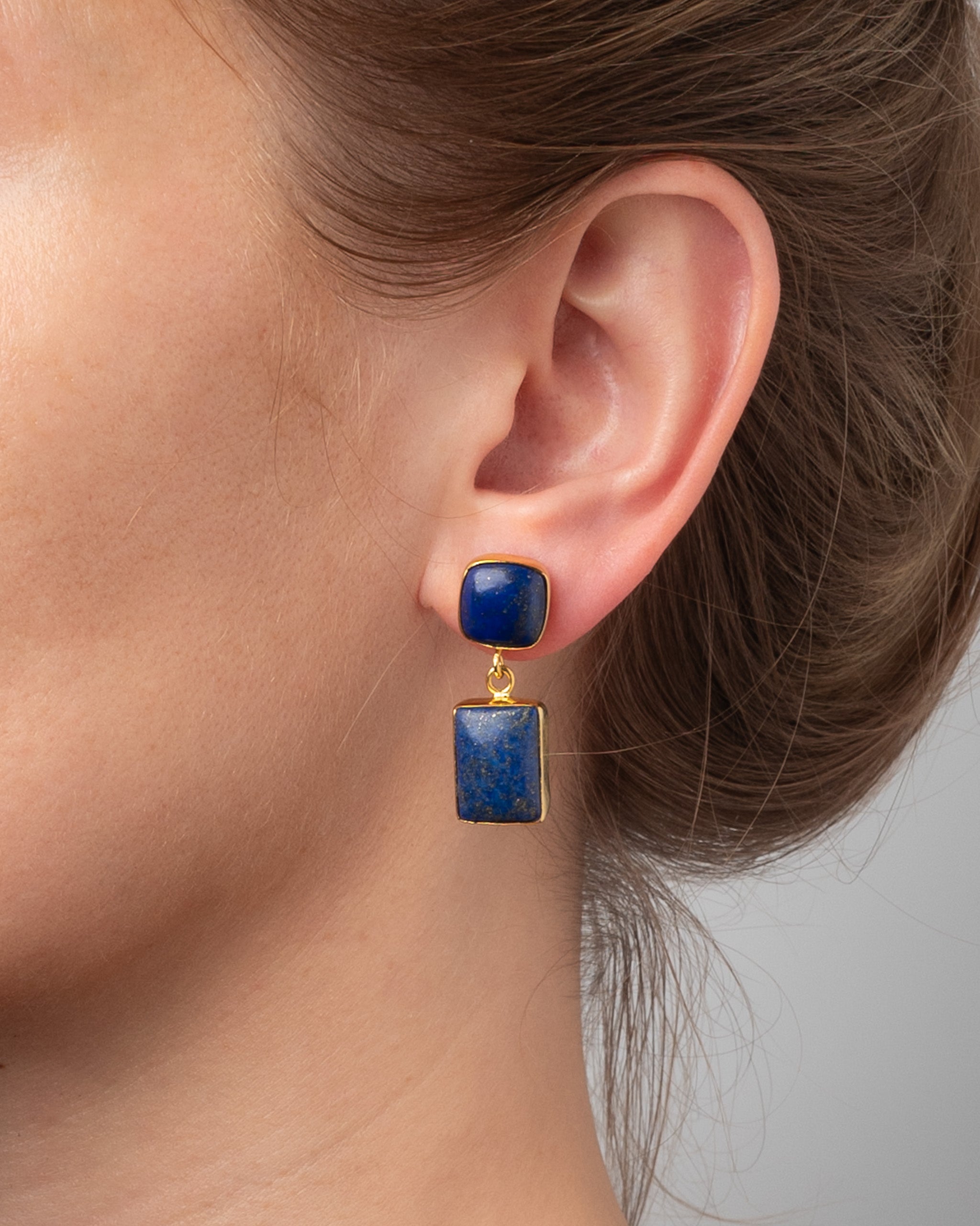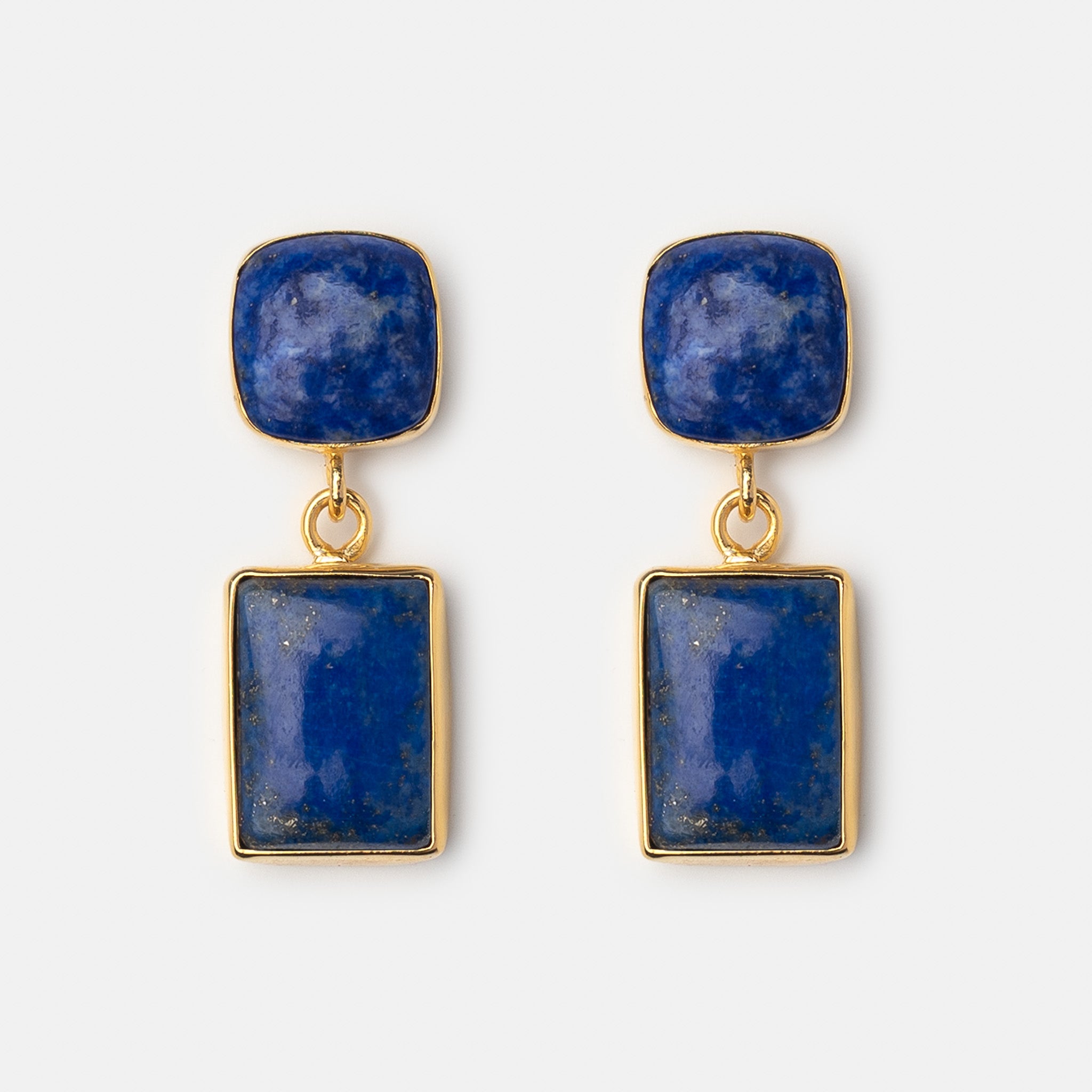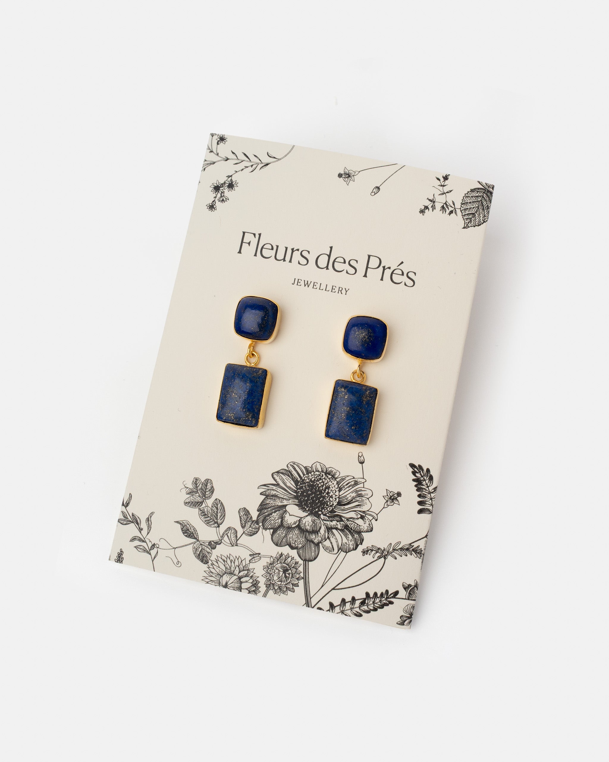 Vergoldete Ohrhänger Thalie von Fleurs des Prés mit blauem Lapislazuli. Die Ohrstecker im Art Deco Stil verbinden geometrischen Formen mit der natürlichen Schönheit des Lapislazuli. Der quadratische Stein mit Stecker trägt einen rechteckigen Stein an einem feinen Ring. Die Schmucksteine sind in einem zarten Rahmen aus 18 Karat vergoldetem Messing gefasst. Handgefertigt.